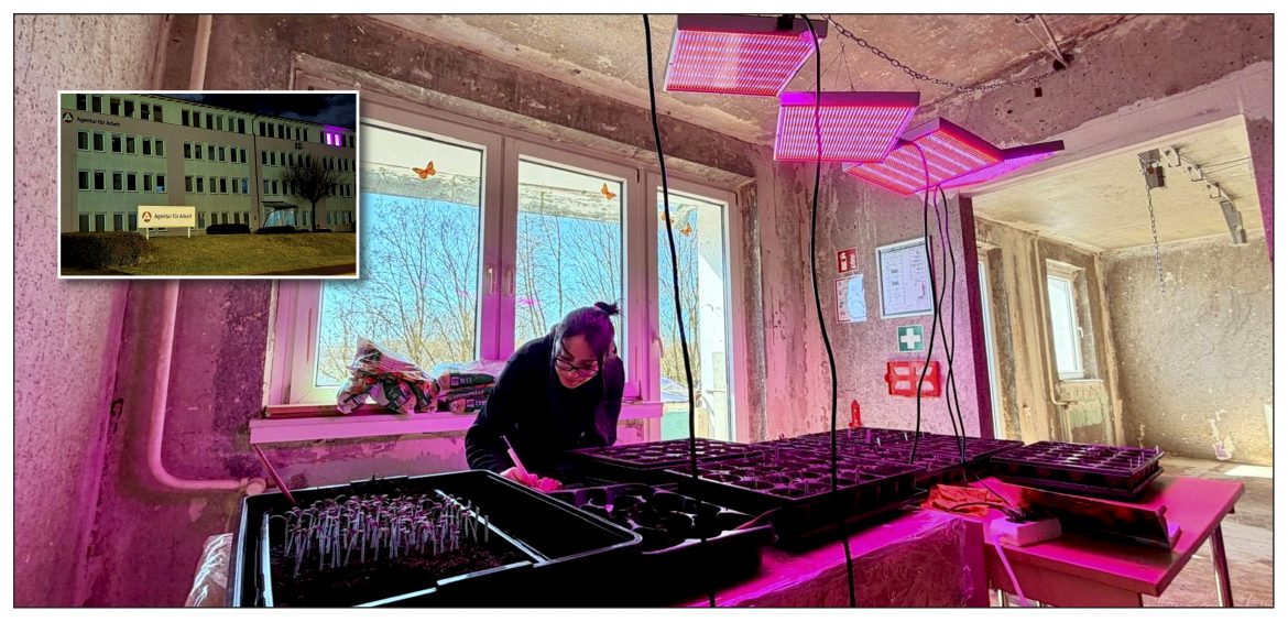 Damit im Blumenblock zur Eröffnung der Landesgartenschau am 23. April ansprechend bepflanzte Hochbeete auf den Balkons zu sehen sind, wurden verschiedene Pflanzen bereits vorgezogen. Salat, rote Bete, Tomaten und weitere Gewächse erhielten dafür Unterstützung durch stromsparende LED-Spezialleuchten. Weil die anhaltenden Minusgrade der vergangenen Wochen eine Anzucht direkt im Blumenblock zunächst noch nicht zuließen, wurde kurzerhand ein Büro in der Siemensstraße zur provisorischen Pflanzen-Kinderstube umfunktioniert.